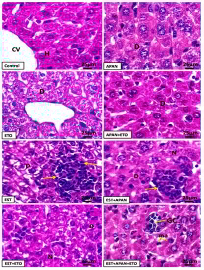Photomicrographs of liver H and E sections of female mice in the different experimental groups. The control group reveals a normal structure of hepatocytes (H) with normal central veins (CV). APAN, ETO, and APAN+ETO groups display mild cytoplasmic vacuolization and degeneration of hepatocytes (D). EST group shows a strong degeneration with cytoplasmic vacuolization (D) and marked inflammatory cells infiltrations with irregular hyperchromatic tumor cell population (thin arrows). EST mice treated with APAN reveal a modest degree of improvement in hepatocyte damage, inflammatory cell infiltrations with some irregular hyperchromatic tumor cells population (thin arrows), giant cell (GC), diffuse necrosis of hepatic tissue (N), and mild degeneration of hepatocytes (D). EST mice treated with ETO show mild diffuse necrosis of hepatic tissue (N), degeneration of hepatocytes with a marked cytoplasmic vacuolization (D), and giant cell (GC). EST mice treated with both APAN+ETO reveal a significant degree of improvement in hepatocyte damage with giant cell (GC) and enlarged macrophage cells (ma). Scale bar, 25 µm.