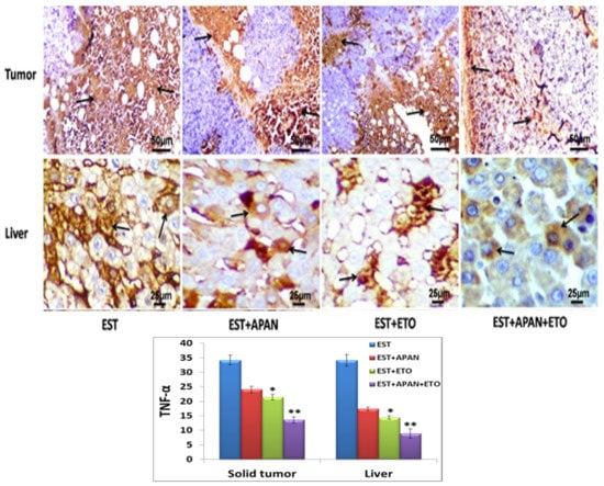 Photomicrographs and chart of TNF-α immunohistochemical expression (arrows) of Ehrlich solid tumor-bearing mice (EST) after mono (EST+APAN or EST+ETO) and dual treatment (EST+APAN+ETO). Scale bar of solid tumor = 50 µm and liver = 25 µm, (*) indicates significantly different, (**) indicates the maximum decrease ratio compared to the EST group, p < 0.01.
