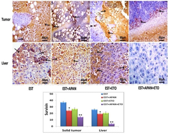 Photomicrographs and chart of survivin immunohistochemical expression (arrows) of Ehrlich solid tumor-bearing mice (EST) after mono (EST+APAN or EST+ETO) and dual treatment (EST+APAN+ETO). Scale bar of solid tumor and liver = 50 µm, (*) indicates significantly different, (**) indicates the maximum decrease ratio compared to the EST group, p < 0.01.