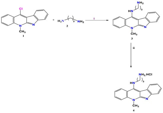 Nuclear magnetic resonance spectroscopy (NMR) analysis was executed with Bruker Bruker magnet system 400,54 Ascend/R (USA) of 400 MHz and 101 MHz for 1H NMR and 13C NMR, respectively, as well as FT-IR spectroscopy was performed with Alpha-Bruker ATR mode (USA) at the Faculty of Science, Zagzig University (Zagzig, Egypt). The commercial starting material 1.3-diamino propane was purchased from Sigma Aldrich and the synthesized mother core of 11-chloroneocryptolepine 1 and its free amine 2 were attained according to methods in the literature [].