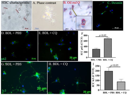 - Investigation on the effects of CQ (60 mg/kg) on HSC activation in 2D BDL mice. (HSCs were isolated from the liver of Sham, BDL + PBS, and BDL + CQ mice groups.)