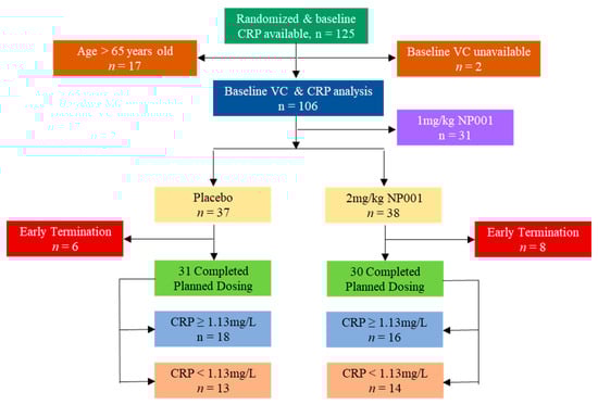 The clinical outcome data evaluated for the current study were the forced vital capacity measurements performed on all patients at baseline and every month until the end of study. Using the patient’s age and height with the actual respiratory volume measured, the % predicted vital capacity (VC) was calculated as described []. The clinical data analysis involved 125 individuals whose baseline CRP values were available from the phase 2A trial. Patients receiving 1 mg/kg NP001 showed an intermediate response compared to placebo and to the 2 mg/kg arm and thus were excluded from the current efficacy analysis. After the exclusion of patients > 65 years old and the group of patients randomized to receive 1 mg/kg NP001, 31 placebo (18 above CRP 1.13 mg/L, 13 below) and 30 NP001 2 mg/kg-treated (16 above CRP 1.13 mg/L, 14 below) participants were left for the efficacy and biomarker analyses. The distribution of participants enrolled in the NP001 phase 2A trial into categories whose data was analyzed in the current study is shown in Figure 1.