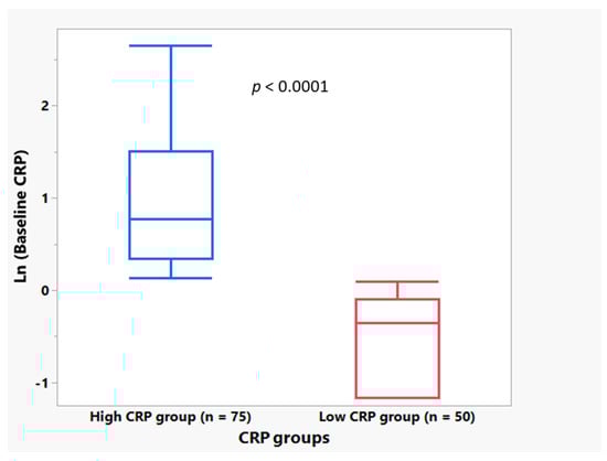 Box and Whisker plots depicting the distribution of baseline plasma CRP values for the high CRP group (CRP ≥ 1.13 mg/L) (n = 75 patients, in blue) and the low CRP group (CRP < 1.13 mg/L) (n = 50 patients, in red) where the bottom of the box depicts the first quartile of the data, the solid line through the box represents the median, and the top of the box depicts the third quartile of the data. The ends of the “whiskers” depict the maximum and minimum values. Results show that median baseline CRP value was statistically significantly higher in the high CRP group compared with the low CRP group (Wilcoxon test, p < 0.0001).