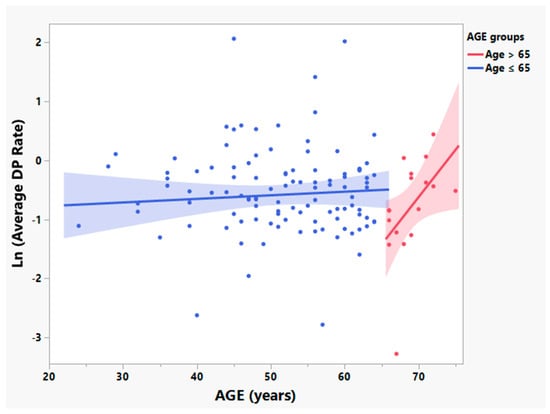 ALS patients aged > 65 years (depicted in red) showed baseline average rates of disease progression (Average DP Rate) different from those patients ≤ 65 years old in the phase 2A trial. Bivariate linear fit was used for the linear regression analysis, and showed a direct relationship between the log transformed DP rate (Average DP Rate) and age among participants > 65 years old (R2: 0.25, p = 0.04, n = 17, depicted in red). No linear association between age and Average DP Rate was found in those ≤ 65 years old (R2 = 0.00, p = 0.51, n = 108, depicted in blue).