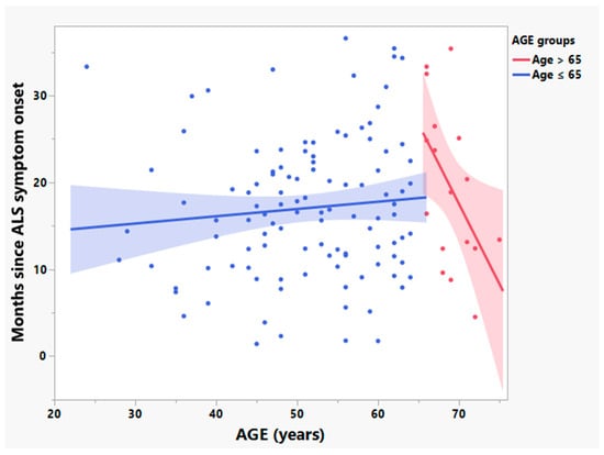 Among ALS patients in the phase 2A NP001 trial, duration of ALS symptom onset differed by age group (≤65 or >65 years old). Bivariate linear fit was used for the linear regression analysis. A negative relationship between the log transformed ALS disease duration (time since ALS symptom onset to baseline) and age was observed in the participants >65 years old (R2: 0.27, p = 0.03, n = 17, depicted in red). No linear association between age and ALS disease duration was found in those ≤ 65 years old (R2 = 0.01, p = 0.32, n = 108, depicted in blue).