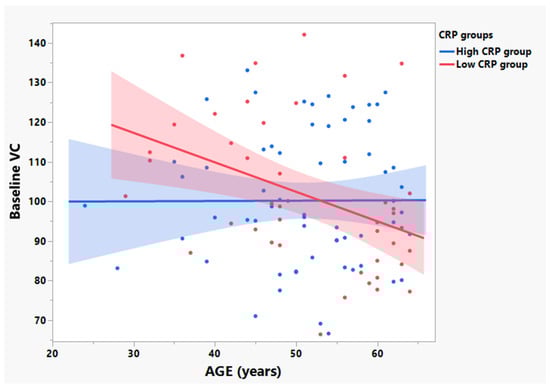 Baseline vital capacity (VC) values worsen with age in ALS patients with low baseline plasma CRP as compared to those with high plasma CRP in the participants age ≤ 65 years old. Bivariate linear fit was used for the linear regression analysis. In the participants aged ≤ 65 years old, baseline VC was negatively related to age in the low CRP group (R2 = 0.16, p = 0.007, n = 44, depicted in red). However, no linear association between baseline VC and age was observed in the high CRP group (R2 = 0.00, p = 0.98, n = 62, depicted in blue).