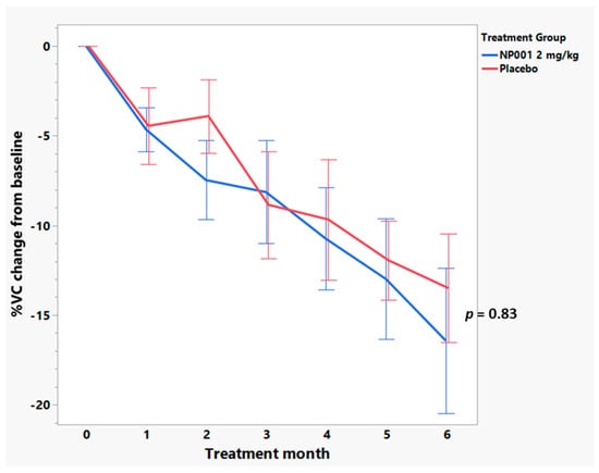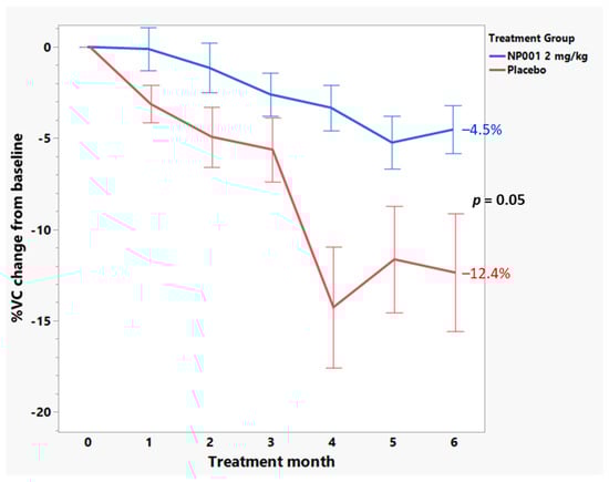 Comparison of vital capacity (VC) change from baseline over the six-month study in participants treated with NP001 compared to placebo in those aged ≤ 65 years old with low plasma CRP at baseline. %VC change from baseline for participants treated with NP001 (n = 14) depicted in blue and compared to placebo group (n = 13) depicted in red. Error bars represent the range, mean ± SEM (standard error of the mean) of %VC change from baseline. No differences were seen between NP001 and placebo groups by the end of study (NP001 = −16.4% vs. Placebo = −13.5%) (Wilcoxon test, p = 0.83).