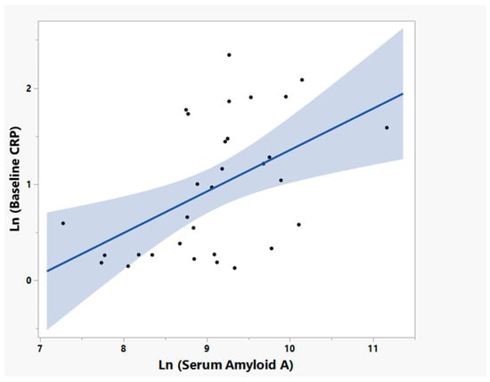 Positive linear relationship of the log transformed baseline plasma CRP and plasma Serum Amyloid A (SAA) in ALS patients age ≤ 65 years old and high plasma CRP at baseline (Bivariate linear regression analysis, R2 = 0.25, p = 0.004, n = 31).