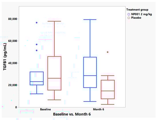 TGFB1 levels significantly increased over the 6-month trial in NP001 treatment compared to placebo controls in participants aged ≤ 65 years old with high plasma CRP at baseline. Box and Whisker plots depicting the distribution of baseline and end of study (month 6) plasma TGFB1 values for NP001-treated (n = 15 patients, in blue) and placebo group (n = 16 patients, in red) where the bottom of the box depicts the first quartile of the data, the solid line through the box represents the median, and the top of the box depicts the third quartile of the data. The ends of the “whiskers” depict the maximum and minimum values (Wilcoxon test, p = 0.89 for baseline and p = 0.02 for month 6).