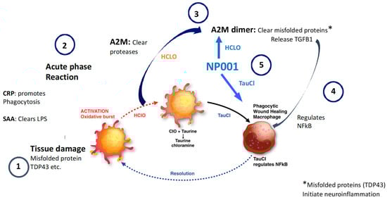 NP001 augments the innate immune activation cycle in ALS patients who have elevated baseline plasma CRP. Step 1: Blood derived macrophages become activated and begin clearance of cells and tissues containing pathogenic proteins and elaborate factors that initiate the acute phase reaction, producing hypochlorous acid as a byproduct of oxidative burst activation. Step 2: Rapid elevation of acute phase reactants including CRP and SAA, both of which amplify > 30×; CRP facilitates clearance of damaged tissues and SAA binds to and clears bacterial byproducts such as LPS. Alpha 2 macroglobulin becomes activated to absorb and remove damaged cell products such as proteases. Anti-inflammatory signaling begins. Step 3: Hypochlorous acid stimulates (1) production of the immune activation regulator taurine chloramine (TauCl). TauCl regulates macrophages to become phagocytic and wound healing and (2) A2M to dimerize and change function. A2M dimers clear misfolded proteins and release pre-synthesized TGFB1 to feedback on proinflammatory processes such as those driven by NFkB. Step 4: TGFB1 is a potent regulator of NFkB and inflammation. Macrophages exposed to TGFB1 become regulators of proinflammatory cells and the innate immune activation cycle is completed. Step 5: NP001 is converted by heme iron to hypochlorite which stimulates steps 3 and 4. TauCl regulates macrophages and hypochlorite stimulates further dimerization of A2M and release of TGFB1.