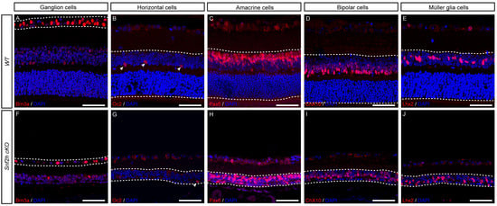 To investigate whether the Snf2h function is not restricted to photoreceptors but is also required for the generation and/or maintenance of other retinal cell types, we performed immunohistochemistry labeling for specific retinal markers of each cell type. We found that GCs (Brn3a-positive cells, Figure 5A,F), HCs (Oc2-positive cells, Figure 5B,G), ACs (Pax6-positive cells, Figure 5C,H), BCs (Chx10-positive cells, Figure 5D,I), and MCs (Lhx2-positive cells, Figure 5E,J) were present in Snf2h-deficient retina. Combined, our data indicate that Snf2h is not necessary for the specification of these cell types in the mature mouse retina.