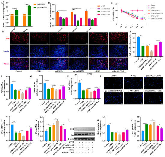 To determine the effect of lnc001776 on apoptosis, pc-lnc001776, si-lnc001776 and their respective NCs were transfected in CPB2 toxin-treated IPEC-J2 cells. pc-lnc001776 markedly elevated lnc001776 expression (800 ng; Figure 2A). Among the three si-lnc001776 siRNAs, si-lnc001776-2 had the most significant knockdown efficiency at 100 nmol (Figure 2B). CCK-8 assay and EdU staining results showed that lnc001776 silencing increased cell proliferation, while overexpression of lnc001776 showed the opposite results (Figure 2C–E). In addition, RT-qPCR results indicated that proliferating cell nuclear antigen (PCNA), cyclin-dependent kinase 4 (CDK4) and cyclinB levels were higher in the si-lnc001776-2 group than in the si-NC group (Figure 2F–H). Hoechst 33258 staining results demonstrated that lnc001776 knockdown dampened CPB2 toxin-generated apoptosis in IPEC-J2 cells (Figure 2I). Likewise, transfection with si-lnc001776-2 accelerated Bcl2 mRNA and protein levels (Figure 2J,L,M) and decreased Bax levels (Figure 2K,L,N). Overall, these data indicate that lnc001776 knockdown suppressed CPB2 toxin-generated apoptosis in IPEC-J2 cells.