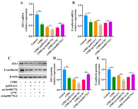 lnc001776 knockdown ameliorated the disruption of IPEC−J2 cell barrier integrity by CPB2 toxin. (A,B) ZO−1 and E-cadherin mRNA expression through RT-qPCR. (C–E) ZO−1 and E−cadherin protein expression via Western blot. * p < 0.05, ** p < 0.01.