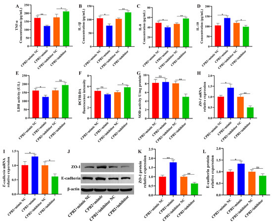 Elevated ssc-let-7i-5p ameliorated IPEC-J2 inflammatory damage and barrier dysfunction induced by CPB2 toxin. (A–D) TNF-α, IL-1β, IL-8 and IL-10 levels via ELISA. (E) LDH activity. (F) ROS level. (G) SOD activity. (H–I) ZO-1 and E-cadherin mRNA expression through RT-qPCR. (J–L) ZO-1 and E-cadherin protein expression through Western blot. ns: not significant. * p < 0.05, ** p < 0.01.