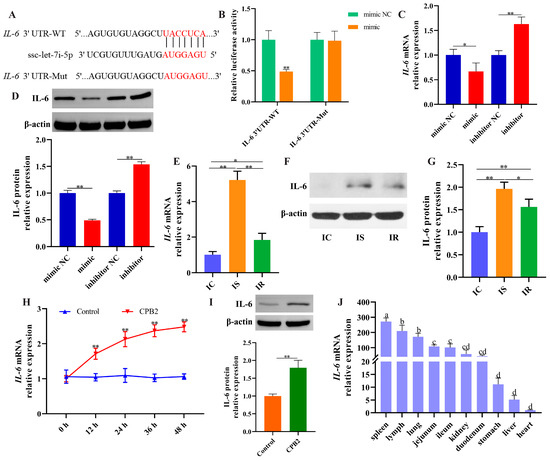 TargetScan (https://www.targetscan.org/vert_72/, accessed on 20 February 2021) identified IL-6 as a candidate target for ssc-let-7i-5p (Figure 8A). As depicted in Figure 8B, ssc-let-7i-5p mimic significantly diminished the fluorescence activity of IL-6 3′UTR-WT, whereas the fluorescence activity of IL-6 3′UTR-Mut was not notably changed (Figure 8B). IL-6 levels were decreased after ssc-let-7i-5p overexpression and increased after ssc-let-7i-5p knockdown (Figure 8C,D). Additionally, IL-6 expression was remarkably higher in the IS group than in the IC and IR groups (Figure 8E–G). Similarly, IL-6 levels were notably increased in CPB2 toxin-treated IPEC-J2 cells after 12 h (Figure 8H,I). As shown in Figure 8J, IL-6 expression was highest in the spleen of healthy piglets and moderately expressed in the intestinal tissues. These data demonstrate that ssc-let-7i-5p directly targeted IL-6.