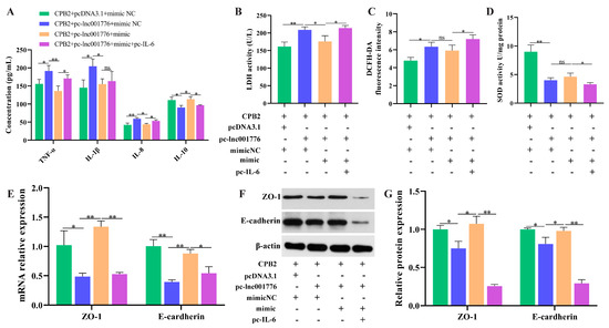 Elevated lnc001776 enhanced CPB2 toxin-triggered inflammatory injury and barrier dysfunction in IPEC-J2 cells via ssc-let-7i-5p/IL-6 axis. (A) TNF-α, IL-1β, IL-8 and IL-10 levels via ELISA. (B) LDH activity. (C) ROS level. (D) SOD activity. (E) ZO-1 and E-cadherin mRNA expression through RT-qPCR. (F,G) ZO-1 and E-cadherin protein expression through Western blot. ns: not significant. * p < 0.05, ** p < 0.01.