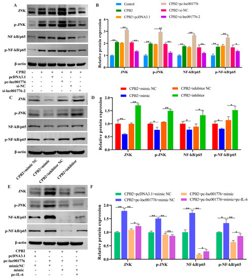 The effect of lnc001776 on the JNK/NF-kB pathway was analyzed by Western blot. As displayed in Figure 11A–D, lnc001776 overexpression and ssc-let-7i-5p knockdown increased JNK, p-JNK, NF-kB/p65 and p-NF-kB/p65 protein levels in CPB2 toxin-induced IPEC-J2 cells, whereas lnc001776 knockdown and elevated ssc-let-7i-5p depressed their expression. Furthermore, ssc-let-7i-5p mimic weakened the promoting effect of lnc001776 on JNK, p-JNK, NF-kB/p65 and p-NF-kB/p65 protein levels, while the introduction of IL-6 partially reversed the effect of let-7i-5p (Figure 11E,F). In conclusion, lnc001776 overexpression activated the JNK/NF-kB pathway via regulating the ssc-let-7i-5p/IL-6 axis.