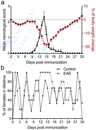 EAE course and estrous cycle dynamics in female DA rats. Neurological score, body weight, and estrous cycle were monitored for 30 dpi. (a) Mean neurological score (± SEM; left Y axis, black diamonds) and mean change in body weight (± SEM; right Y axis, red circles) for every dpi from a representative experiment; (b) The mean percentage of females in diestrus for every dpi from the Control (n = 6, black triangles, full line) and EAE groups (n = 5, open diamonds, dashed line) in a representative experiment.