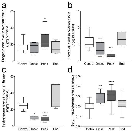 Sex steroid hormone levels in ovarian steroid extracts and in serum. Progesterone, estradiol, and testosterone levels in steroid extracts and in serum were measured by ELISA. (a) Ovarian progesterone (µg/g of tissue); (b) ovarian estradiol (ng/g of tissue); (c) ovarian testosterone (ng/g of tissue); (d) serum testosterone (ng/mL). The results are plotted as the median values of the hormone concentration. The horizontal line in each box plot indicates the median value, the box limits indicate quartile 1 and quartile 3, and the vertical whisker lines represent minimum and maximum values (n ≥ 5 animals/group). * p < 0.05, ** p < 0.01, *** p < 0.001, **** p < 0.0001; Kruskal–Wallis test followed by uncorrected Dunn’s post hoc test.