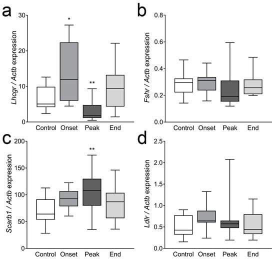 Gene expression of the receptors for gonadotropins and receptors for cholesterol uptake in ovarian tissue. Ovarian tissue from each animal of the Control, Onset, Peak, and End groups was processed for mRNA isolation, reverse transcription, and gene expression analysis by qPCR. (a) Lhcgr, (b) Fshr, (c) Scarb1, (d) Ldlr. The results are presented as the median values of relative expression of the target gene (compared to Actb). The horizontal line in each box plot indicates the median value, the box limits indicate quartile 1 and quartile 3, and the vertical whisker lines represent minimum and maximum values (n ≥ 11 animals/group). * p < 0.05, ** p < 0.01; Kruskal–Wallis test followed by uncorrected Dunn’s post hoc test.