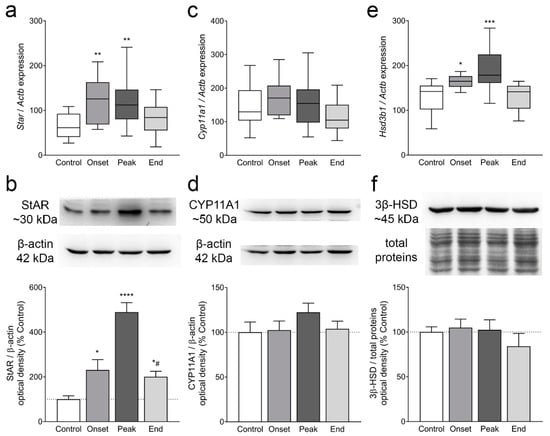 Gene and protein expression of StAR, CYP11A1, and 3β-HSD in ovarian tissue. One ovary from each animal was used for gene expression analyses by qPCR (a,c,e), while the other ovary was pooled for protein isolation and Western blot analysis (b,d,f). (a) Star; (b) StAR; (c) Cyp11a1; (d) CYP11A1; (e) Hsd3b1; (f) 3β-HSD. The results in (a,c,e) are plotted as the median values of relative expression of the target gene compared to Actb. The horizontal line in each box plot indicates the median value, the box limits indicate quartile 1 and quartile 3, and the vertical whisker lines represent minimum and maximum values (n ≥ 12 animals/group). Figures (b,d,f) are presented as representative blots (top panels) and quantification results (bottom panels). The results were calculated as the optical density of the target proteins relative to β-actin (b,d) or total proteins (f), normalized to the Control (presented as 100% ± SEM), and plotted as the mean change ± SEM (n ≥ 5 Western blot experiments). * p < 0.05, ** p < 0.01, *** p < 0.001, **** p < 0.0001, compared to the Control group; # p < 0.05, compared to the Peak group; Kruskal–Wallis test followed by uncorrected Dunn’s post hoc test.