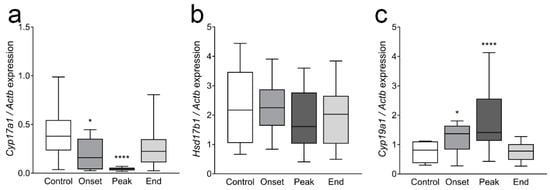 The expression pattern of Cyp17a1, Hsd17b1, and Cyp19a1 in ovaries. One ovary from each animal of all experimental groups was processed for mRNA isolation, and gene expression was analyzed by qPCR. (a) Cyp17a1, (b) Hsd17b1, (c) Cyp19a1. The results are presented as the median values of relative expression of the target gene (compared to Actb). The horizontal line in each box plot indicates the median value, the box limits indicate quartile 1 and quartile 3, and the vertical whisker lines represent minimum and maximum values (n ≥ 12 animals/group). * p < 0.05, **** p < 0.0001; Kruskal–Wallis test followed by uncorrected Dunn’s post hoc test.