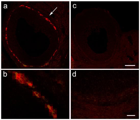 Immunofluorescent labeling of CYP17A1 in ovarian tissue. Bouin-fixed, paraffin-embedded ovaries were cut on a microtome, and the slices were labeled using CYP17A1 antibody. (a) Representative follicle from the ovary of the Control group, in the diestrus phase, showing a strong CYP17A1-specific signal in the theca interna region of the follicle (arrow). (b) Higher magnification of the theca interna region, from the Control group animal, showing CYP17A1+ staining in the cytoplasm of theca cells. (c) Ovarian tissue slice of a female from the Peak group, in prolonged diestrus lasting for four days, showing the absence of CYP17A1 labeling. (d) Higher magnification of ovarian tissue from the female of the Peak group. Scale bar: 100 µm—(c), also applies to (a); 20 µm—(d), also applies to (b).