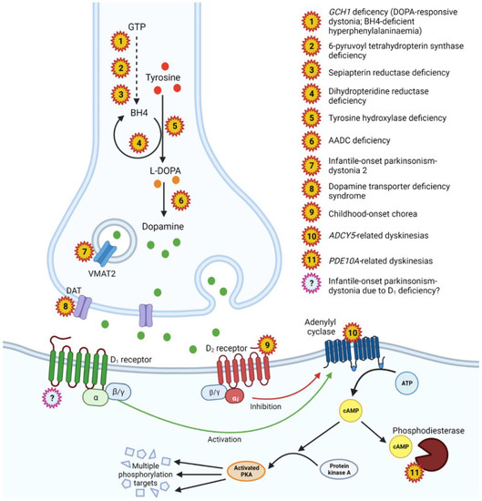 Reid KM, Steel D, Nair S, Bhate S, Biassoni L, Sudhakar S, Heys M, Burke E, Kamsteeg E-J, Genomics England Research Consortium, et al. Loss-of-Function Variants in DRD1 in Infantile Parkinsonism-Dystonia. Cells. 2023; 12(7):1046. https://doi.org/10.3390/cells12071046