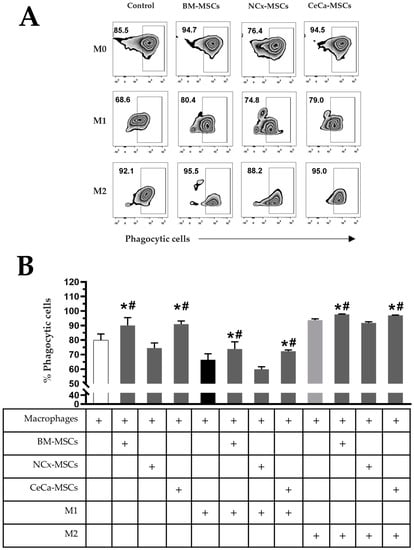 CeCa-MSCs, unlike NCx-MSCs, increase the phagocytosis capacity of macrophages. (A) Plot representative of the percentage of phagocytic cells. (B) Bar graph of the mean percentage of phagocytic cells evaluated with E. coli bioparticles. Bar graphs represent the mean and standard deviation. * Significant difference with respect to the control, # significant difference with respect to NCx-MSCs (p < 0.05); n = 6. M0, absence of inducer medium; M1, inducer medium for M1 polarization; M2, inducer medium for M2 polarization.