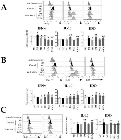 Coculture with CeCa-MSCs and BM-MSCs increases the intracellular expression of IL-10 and IDO in macrophages. (A) Representative histograms and bar graphs of the fold increase with respect to the M0 control for intracellular molecules in macrophages cocultured with MSCs in the absence of inducer medium. (B) Representative histograms and bar graphs of the fold increase with respect to the M1 control for intracellular molecules in macrophages cocultured with MSCs in the presence of M1 inducer medium. (C) Representative histograms and bar graphs of the fold increase with respect to the M2 control for intracellular molecules in macrophages cocultured with MSCs in the presence of M2 inducer medium. Bar graphs represent the mean and standard deviation. * Significant difference with respect to the control, # significant difference with respect to NCx-MSCs (p < 0.05); n = 6. M0, absence of inducer medium; M1, inducer medium for M1 polarization; M2, inducer medium for M2 polarization.