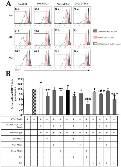 CeCa-MSCs increase the capacity of macrophages to decrease CD4+ T cell proliferation. (A) Representative histogram of the percentage of CFSE-labeled CD4+ T cell proliferation. (B) Bar graph of the normalized percentage of proliferative CD4+ T cells. Bar graphs represent the mean and standard deviation of the percentage of proliferating CD4+ T cells from each condition indicated in the table. Activated CD4+ T cells without macrophages were used to normalize the percentage. * Significant difference from the control of macrophages, # significant difference from NCx-MSCs, + significant difference from the control of activated CD4+ T cells, (p < 0.05); n = 6. M0, absence of inducer medium; M1, inducer medium for M1 polarization; M2, inducer medium for M2 polarization.