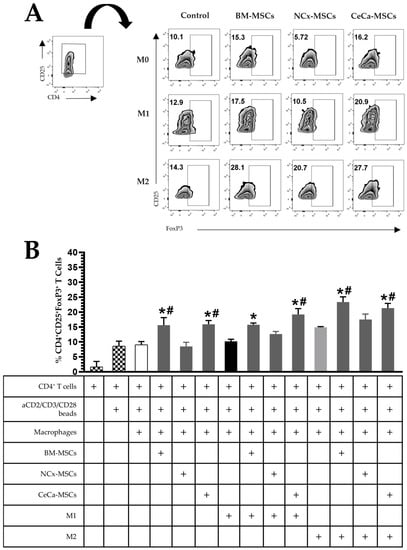 CeCa-MSCs, unlike NCx-MSCs, increase the ability of macrophages to generate CD4+CD25+FoxP3+ regulatory T lymphocytes. (A) Plot representative of the percentage of CD4+CD25+FoxP3+ regulatory T lymphocytes. (B) Bar graph of the percentage of CD4+CD25+FoxP3+ regulatory T lymphocytes. Bar graphs represent the mean and standard deviation. * Significant difference from the control, # significant difference from NCx-MSCs (p < 0.05); n = 6. M0, absence of inducer medium; M1, inducer medium for M1 polarization; M2, inducer medium for M2 polarization.