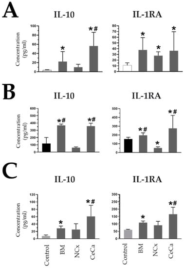 In the absence and presence of inducing medium, in the cocultures with CeCa-MSCs, the concentration of IL-10 increased (M0: 56.49 pg/mL ± 29.70; p < 0.05; M1: 356.82 pg/mL ± 42.17; p < 0.05; M2: 60.98 pg/mL ± 29.84; p < 0.05) with respect to that observed for NCx-MSCs and the control (M0: 9.94 pg/mL ± 6.53 and 3.58 pg/mL ± 0.90, respectively; p < 0.05; M1: 62.02 pg/mL ± 10.15 and 117.5 pg/mL ± 83.28, respectively; p < 0.05; M2: 26.18 pg/mL ± 13.69 and 7.61 pg/mL ± 2.79, respectively; p < 0.05) (Figure 6A–C). In cocultures with inducing media, the presence of CeCa-MSCs increased the concentration of the interleukin-1 receptor antagonist (IL-1RA) (M1: 276.41 pg/mL ± 147.28; p < 0.05; M2: 166.60 pg/mL ± 46.84; p < 0.05) compared with that observed for NCx-MSCs or the control (M1: 52.85 pg/mL ± 12.02 and 153.95 pg/mL ± 20.25, respectively; p < 0.05; M2: 91.64 pg/mL ± 26.66 and 60.22 pg/mL ± 3.67, respectively; p < 0.05) (Figure 6A–C). In contrast, the highest concentrations of two proinflammatory molecules, TNFα and IL-1β, were observed in cocultures of NCx-MSCs in the presence of M1 (767.32 pg/mL ± 383.49; p < 0.05 and 322.46 pg/mL ± 55.35; p < 0.05, respectively) (Supplementary Figure S3). These results indicate that the presence of CeCa-MSCs, unlike NCx-MSCs, favors an increase in the concentrations of soluble anti-inflammatory molecules and a decrease in the concentrations of proinflammatory molecules in a coculture system with macrophages, an effect that is related to their ability to polarize macrophages toward an M2 phenotype.
