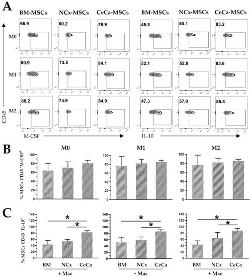 Intracellular expression of M-CSF and IL-10 in CeCa-MSCs cocultured with macrophages. (A) Plots representative of the intracellular expression of M-CSF and IL-10 in MSCs from different sources cocultured in the presence of macrophages and M0, M1 or M2 inducing media. (B) Percentage of CD45- M-CSF+ MSCs in coculture with macrophages. (C) Percentage of CD45- IL-10+ MSCs in coculture with macrophages. Bar graphs represent the mean and standard deviation. * Significant difference (p < 0.05); n = 6. Mac: macrophages. M0, absence of inducer medium; M1, inducer medium for M1 polarization; M2, inducer medium for M2 polarization.