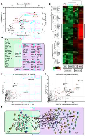 As shown in Figure 1C, in APEX off condition, the streptavidin staining is diffuse in the cytoplasm. In SCH APEX, the streptavidin staining colocalizes with Sec24 at ER exit sites, consistent with the expected localization of Sec24 in growing conditions [16]. In KRB APEX on condition, Sec24 co-localizes perfectly with local biotinylation in Sec bodies induced by KRB. Biochemically, proximally biotinylated proteins can be prominently retrieved by streptavidin pulldown (Figure 1D), against the background of endogenously biotinylated proteins, such as acetyl-coA carboxylases. With two independent experiments, each activating Sec24-APEX2 under the growing (SCH) or stress (KRB) conditions, we aim to elucidate the protein composition of Sec bodies in a hypothesis-free and unbiased manner (Figure 1E,F) by mass spectrometry.