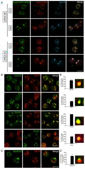 Validation of Sec body proteins by fluorescence confocal microscopy. (A) Immunofluorescence visualization of Sec24AB-GFP-APEX2 (green), Sec16 (cyan) and biotin (Strept-A568, red). Sec16 completely co-localizes with Sec24-GFP-APEX2 and biotin. (B,B’) Immunofluorescence visualization of endogenous GM130, Hrs, Homer (green) in Sec bodies (marked by Sec16, red), as well as Lasp (red) and Homer (green). (B’) Percentage of Sec bodies positive for these candidates. Error bars in denote standard deviation in the number of Sec bodies positive for overlap with each target, across 50 image fields. (C,C’) Immunofluorescence visualization of overexpressed Rox8-V5 (anti V5, green) in close proximity of Sec bodies (marked by Sec16). Percentage of Sec bodies positive for Rox8-V5 (C’). Scale bar: 10 µm. Immunofluorescence visualization of putative Sec body proteins and Rox8 in SCH media is shown in Supplementary Figure S1.