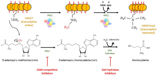 Development of EZH2 inhibitors has been driven by enhanced EZH2 activity being implicated in many diseases, including cancer [27,39]. EZH2 inhibitors can be divided into two groups: indirect inhibitors and direct inhibitors. EZH2 indirect inhibitors include 3-deazaneplanocin A (DZNep) and its less toxic analog form, named D9 [44]. During the formation of H3K27 methylation, the methyl group is catalytically transferred from a universal methyl donor, S-adenosyl-L-methionine (SAM), to the lysine side chains of the acceptor protein. The loss of a methyl group turns SAM into S-adenosyl-L-homocysteine (SAH), which is further metabolized by SAH hydrolase [23] (Figure 2). The EZH2 indirect inhibitors suppress the activity of SAH hydrolase, leading to an accumulation of SAH in cells, subsequently blocking the release of the methyl group from SAM and causing indirect inhibition of EZH2 methyltransferase activity [23,45]. As such, EZH2 indirect inhibitors are also called SAH hydrolase inhibitors. DZNep is the first identified EZH2 inhibitor that is not a selective EZH2 antagonist. Rather, DZNep is known to inhibit all methylation in histone and probably suppresses diverse methyltransferase [45,46].