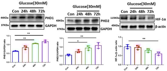 Time course of high-glucose (HG) upregulated PHDs expression and reduced HIF-1α expression in H9c2 cells. Western blot analysis demonstrating that exposure of H9c2 cells to HG (30 mM) for 24, 48, and 72 h resulted in a gradual increase in expression of PHD1 and PHD2 as compared to control normal glucose (5.5 mM). Densitometries showed a significant upregulation of PHD1 and PHD2 expression at 48 h and 72 h. Exposure of H9c2 cells to HG (30 mM) for 24, 48, and 72 h resulted in a gradual reduction in HIF-1α expression as compared to control normal glucose (5.5 mM). Densitometries showed a significant downregulation of HIF-1α expression at 72 h. All data represent mean ± SD (n = 3 per group, * p < 0.05 and ** p < 0.01). Circle, square and triangle were denoted the different experiment groups as indicated in the figures.