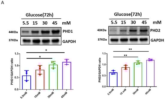 Dose response of high-glucose (HG)-induced upregulation of PHDs expression and reduction in HIF-α expression in H9c2 cells. (A) Western blot analysis revealing that exposure of H9c2 cells to different concentrations of glucose (15, 30, 45 mM) for 72 h resulted in a dose-dependent increase in expression of PHD1 and PHD2 as compared to normal glucose (5.5 mM). Densitometries showed a significant upregulation of PHD1 and PHD2 expression at 30 mM and 45 mM. (B) Exposure of H9c2 cells to different concentrations of glucose (15, 30, 45 mM) for 72 h resulted in a dose-dependent reduction in HIF-1α and HIF-2α expression as compared to normal glucose (5.5 mM). Densitometries showed a significant reduction of HIF-1α and HIF-2α expression at 30 mM and 45 mM. (C) Exposure of H9c2 cells to different concentrations of glucose (15, 30, 45 mM) for 72 h resulted in a gradual increase in expression of TGF-β, but a significant reduction in Ang-1 expression as compared to normal glucose (5.5 mM). Densitometries showed that the expression of Ang-1 and TGF-β1 was significant differences at 30 mM and 45 mM concentrations. All data represent mean ± SD (n = 3 per group, * p < 0.05 and ** p < 0.01). Circle, square and triangle were denoted the different experiment groups as indicated in the figures.