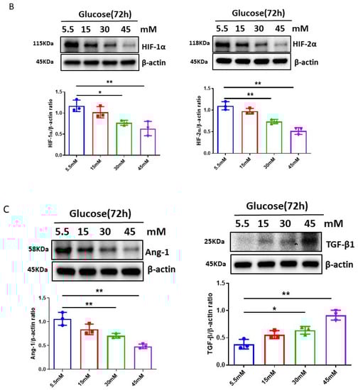 To explore the effects of HG on hypoxic signaling, the time- and dose-dependent expression of PHDs-HIF-α under normal-glucose (5.5 mM) or high-glucose conditions in H9c2 cell lines were examined. The exposure of H9c2 cell lines to HG (30 mM) for various time periods up to 72 h led to a gradual increase in PHD1 and PHD2 expression as compared to control normal glucose (5.5 mM). This was accompanied by the downregulation of HIF-1α expression (Figure 1). Furthermore, the exposure of H9c2 cell lines to various concentrations of HG (15, 30, and 45 mM) for 72 h resulted in a dose-dependent increase in PHD1 and PHD2 expression and the downregulation of HIF-1α and HIF-2α expression as compared to normal glucose (5.5 mM). The exposure of H9c2 cells to HG also caused a dose-dependent reduction in Ang-1 expression and upregulation of TGF-β expression as compared to normal glucose (5.5 mM) (Figure 2A–C).