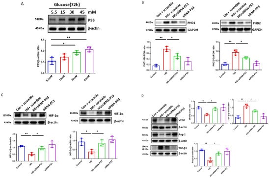 Knockdown of p53 by p53 siRNA was confirmed by Western blot in our previous study []. As shown in Figure 3B, pretreatment of H9c2 with p53 siRNA significantly reduced HG-induced PHD1 and PHD2 expression in H9c2 cells. These were followed by a significant upregulation of HIF-1α and HIF-2α expression (Figure 3C). Pretreatment with p53 siRNA also significantly increased angiogenic growth factor Ang-1 and VEGF levels, whereas HG-induced TGF-β expression was blunted in H9c2 cells (Figure 3D).