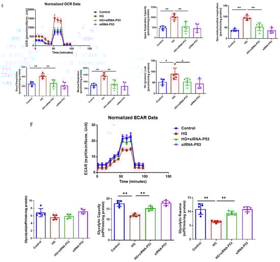 We next examined whether the activation of p53 altered cell metabolism in H9c2 cells under HG conditions by measuring oxygen consumption rate (OCR) and glycolysis (ECAR) using the Seahorse analyzer. The exposure of H9c2 cells to HG for 72 h resulted in a significant increase in OCR, non-mitochondrial respiration, and proton leak (Figure 3E). Pretreatment with p53 siRNA significantly attenuated HG-induced OCR, non-mitochondrial respiration, and proton leak in H9c2 cells (Figure 3E). Furthermore, the exposure of H9c2 cells to HG led to an impairment of glycolysis and glycolytic capacity. Pretreatment with p53 siRNA significantly improved the HG-induced impairment of glycolysis and glycolytic capacity in H9c2 cells (Figure 3F).