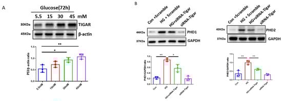 To further elucidate the potential signaling pathway of p53 in the HG-induced impairment of HIF-α signaling, the levels of TIGAR, downstream of p53 signaling, were examined in H9c2 cells under different glucose concentrations. As shown in Figure 4A, the exposure of H9c2 cell lines to various concentrations of HG (15, 30, and 45 mM) for 72 h resulted in a dose-dependent upregulation of TIGAR expression as compared to normal glucose (5.5 mM). The exposure of H9c2 cell lines to mannitol (30 mM) had no effects on the levels of TIGAR expression [].