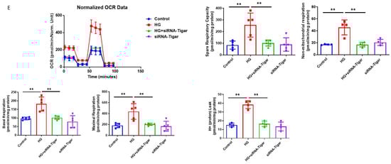 Knockdown of TIGAR by TIGAR siRNA was confirmed in our previous study []. As shown in Figure 4B, pretreatment with TIGAR siRNA significantly reduced HG-induced PHD1 and PHD2 expression, accompanied by significant increases in HIF-1α and HIF-2α expression in H9c2 cells (Figure 4C). Pretreatment with TIGAR siRNA also significantly blunted HG-induced FSP-1 expression (Figure 4D). Furthermore, pretreatment with TIGAR siRNA altered cell metabolism as evidenced by a significant reduction in HG-induced OCR, non-mitochondrial respiration, and proton leak in H9c2 cells (Figure 4E).