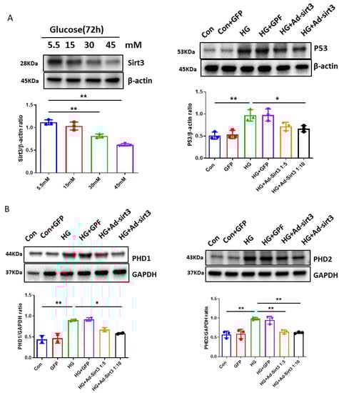 Our previous study also demonstrated that the expression of PHD1 and PHD2 was upregulated, whereas HIF-2α was downregulated in SIRT3KO mouse hearts []. Moreover, the inhibition of PHDs upregulated hypoxic signaling, improved glycolysis, and reduced oxygen consumption rate in endothelial cells. This led to a significant improvement in angiogenesis and cardiac function, suggesting that SIRT3 deficiency may impair hypoxic signaling []. However, whether an HG-induced reduction in SIRT3 contributes to the impairment of hypoxic signaling in diabetes remains unexplored. To test the direct link between SIRT3 and the disruption of PHDs-HIF-α signaling, H9c2 cells were transfected with adenovirus-SIRT3 and subsequently exposed to high-glucose conditions. Under HG conditions, SIRT3 levels were reduced in a dose-dependent manner. The overexpression of SIRT3 significantly attenuated the HG-induced upregulation of p53 and PHDs, followed by a significant increase in HIF-1α expression, suggesting a novel regulatory role of SIRT3 in hypoxic signaling under hyperglycemic conditions. Using diabetic db/db mice treated with Ad-SIRT3, we further validated that the overexpression of SIRT3 reduced the expression of myocardial PHDs, which were accompanied by increased HIF-1α levels in diabetic hearts. These in vivo results further support the regulatory role of SIRT3 in hypoxic signaling of the diabetic heart. Our present data also indicate that the p53/TIGAR axis appears to be the key signaling pathway modulating the PHDs-HIF-α pathway under hyperglycemic conditions since the knockdown of p53 and TIGAR resulted in a reduction in PHD expression and the upregulation of HIF-α expression.