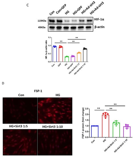 Next, we examined whether SIRT3 altered p53 and PHDs-HIF-α expression in H9c2 cells. H9c2 cell lines were infected with adenovirus-SIRT3 at different concentrations (1:5 or 1:10) or control Ad-GFP. The efficacy of Ad-SIRT3 transfection in H9c2 cell lines was demonstrated in our previous study []. As shown in Figure 5A, Ad-SIRT3 treatment resulted in a significant reduction in p53 expression in H9c2 cell lines. Furthermore, Ad-SIRT3 treatment significantly reduced PHD1 and PHD2 expression (Figure 5B), followed by a significant increase in HIF-1α expression (Figure 5C). Ad-SIRT3 treatment also significantly attenuated HG-induced FSP-1 expression in H9c2 cell lines (Figure 5D).