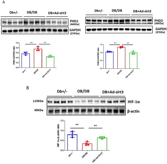 The regulatory role of SIRT3 in cardiac PHDs-HIF-1α signaling was further validated in the diabetic db/db mice. Treatment with Ad-SIRT3 significantly reduced levels of myocardial PHD1 and PHD2 expression, together with increased HIF-1α levels in the hearts of db/db mice (Figure 6A,B). Furthermore, treatment with Ad-SIRT3 significantly reduced myocardial FSP-1 expression in the hearts of db/db mice (Figure 6C).