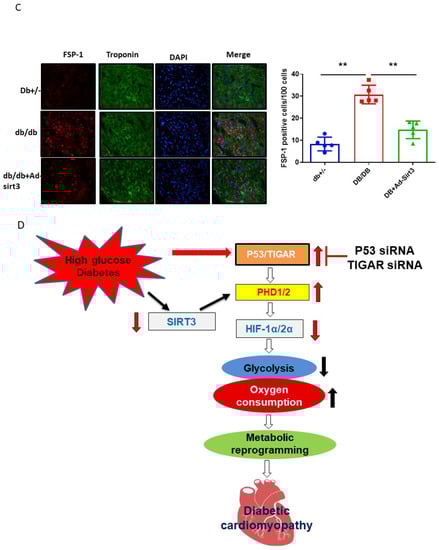 SIRT3 regulates hypoxic signaling in the hearts of diabetic db/db mice. (A) Western blot and densitometric analysis demonstrating that expression of PHD1 and PH2 were significantly increased, while treatment with Ad-SIRT3 (1 × 109 PFU) significantly reduced the expression of PHD1 and PHD2 in the hearts of diabetic db/db mice. (B) Western blot and densitometric analysis showing that the expression of HIF-1α was significantly reduced, while treatment with Ad-SIRT3 (1 × 109 PFU) significantly upregulated the expression of HIF-1α in the hearts of diabetic db/db mice. (C) Representative images and quantitative analysis showing that treatment with Ad-SIRT3 significantly reduced myocardial FSP-1 levels in db/db mice by FSP-1 immunostaining (Red, 10X Magnification). All data represent mean ± SD (n = 4 per group, ** p < 0.01). Circle, square and triangle were denoted the different experiment groups as indicated in the figures. (D). Novel role of p53/TIGAR signaling pathway in the regulation of hyperglycemia and diabetes-induced metabolic programming by a mechanism involvement of disruption of PHDs/HIFs. High glucose activates prolyl hydroxylases and disrupts HIF-α signaling, which alters cell metabolism by a reduction in glycolysis while increasing the oxygen consumption rate in cardiomyocytes. Mechanistically, knockdown of p53/TIGAR increased glycolysis under high glucose conditions and suppressed HG-induced increases in oxygen consumption rate. Therefore, targeting the p53/TIGAR axis may alleviate hyperglycemia-induced cardiomyopathy via a mechanism involving the hypoxic signaling pathway and reprogrammed cell metabolism.