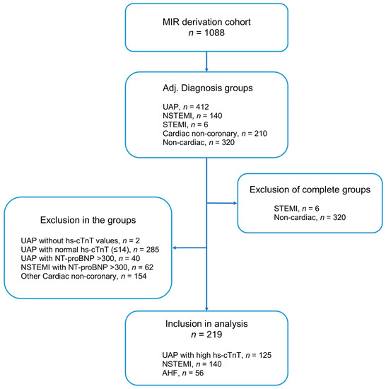 Role of Copeptin and hs-cTnT to Discriminate AHF from Uncomplicated NSTE-ACS with Baseline Elevated hs-cTnT—A Derivation and External Validation Study