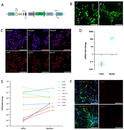 NPCs differentiate into immature cortical neurons in vitro. (A) Lentiviral construct expressing GFP used for NPCs labeling, adapted from [9]. (B) GFP is expressed in NPCs (left panel) and 30-day-old neurons (right panel). Scale bar = 100 µm. (C,D) NPCs express the neuronal progenitor markers Ki67, SOX2, and Nestin at passage 28 (C). The plot (D) shows mRNA expression fold-change as compared to human fetal brain. qPCR results were normalized to GAPDH and calculated with the ΔCT method (data are from three independent cultures). (E) mRNA relative expression of differentiation markers at NPCs and neuronal stage. Data are expressed as fold change to GAPDH calculated with the ΔCT method (* p < 0.05; ** p < 0.002; *** p < 0.0002; **** p < 0.0001, unpaired t-test). (F) Neurons do not express the astrocyte marker GFAP. Only a small proportion of cells remained SOX2 positive after 30 days of differentiation. Scale bars = 100 µm.